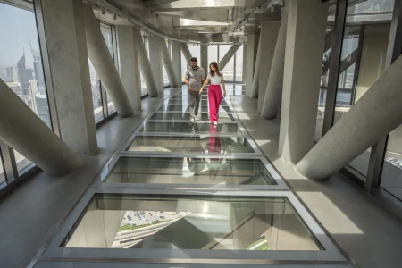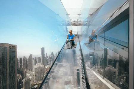Mientras caminas por el puente de piso de vidrio, puedes disfrutar de las vistas de Dubái desde 219 metros de altura y vivir momentos llenos de adrenalina en el tobogán de vidrio (Glass Slide). Si tienes coraje, puedes observar Dubái desde una perspectiva inolvidable caminando con un arnés de seguridad por el Edge Walk en la fachada del rascacielos.